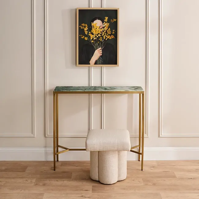 The Chloe Dusty Jade Marble Console Table in Gold is a captivating addition to the Chloe range, blending timeless design with rich, luxurious detail. Its matte polished Dusty Jade marble top—swirled with soft green, grey, and charcoal veining—brings an earthy elegance to any space. Framed in slender brushed gold stainless steel, the silhouette is refined yet striking. Perfect for hallways or living spaces, this console is available in two sizes and arrives fully assembled for effortless, ready-to-style sophistication.