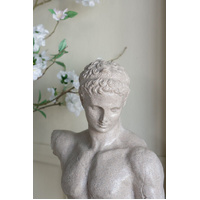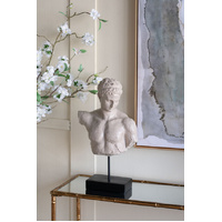 Inspired by the graceful beauty of Greco-Roman sculptures, this male bust statue features a beige, stone-like finish, a sleek black stand, and intricate detailing. Whether displayed alone or added to a classically themed ensemble, it will capture the eye from any large tabletop, bookshelf, or counter.