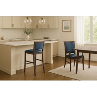 Hudson bar stool Chair. Faux Leather Seat. Backrest in Blue fabric. Moisture resistant Seat. wipeable, comfortable, contemporary.