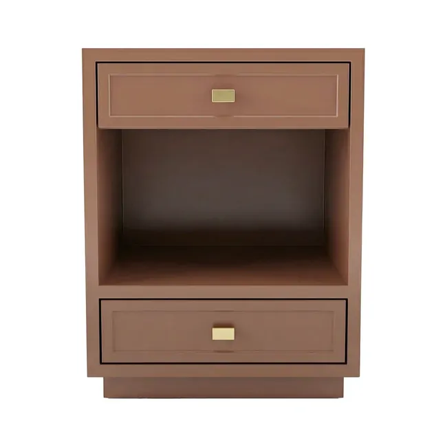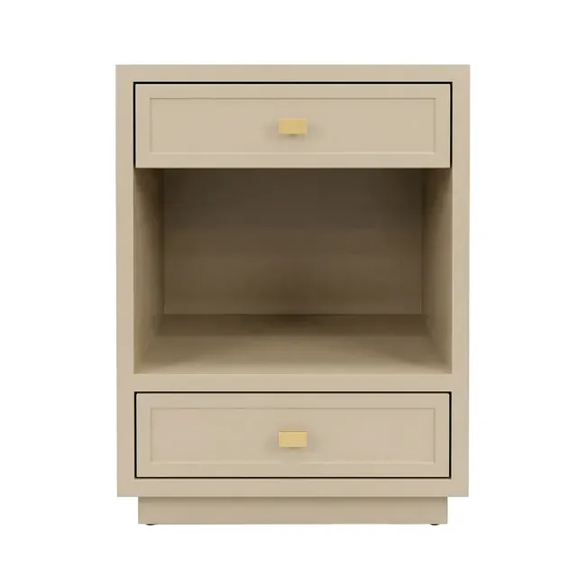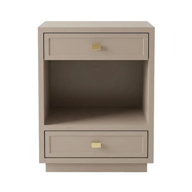 Elevate your bedroom with the Logan bedside table in soft grey. Its subtle shaker panelling and clean-edged silhouette are brought to life by a satin finish that adds depth and softness. Featuring a double drawer and open shelf, it balances practicality with polished design. Paired with a brushed gold handle, the Logan in grey blends seamlessly into modern and transitional spaces alike. Available in Grey, Beige ,Mocha Mousse & Taupe