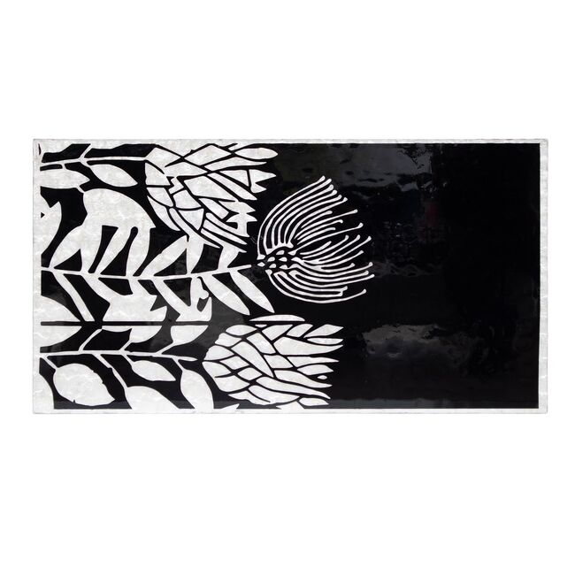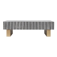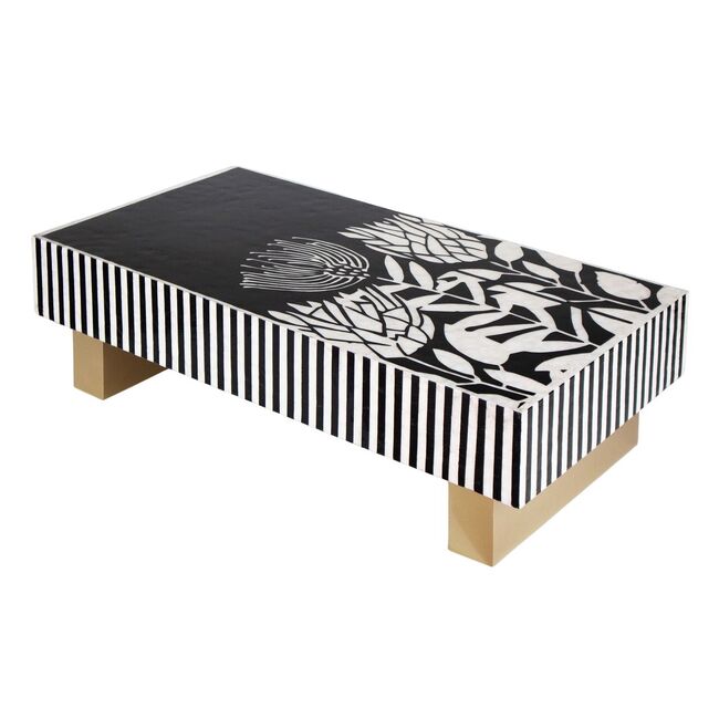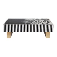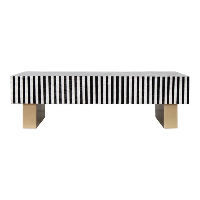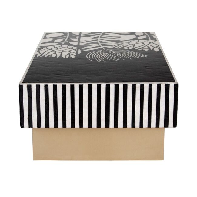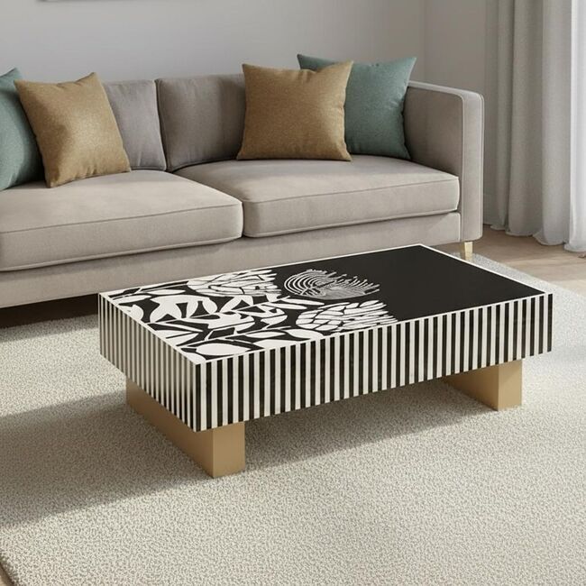 Where optical illusion meets artisan refinement. Step into a world where craftsmanship bends perception. The Atelier Pearl Vortex coffee table is a masterclass in visual tension and handcrafted elegancedesigned for interiors that embrace bold statements and meticulous detail. The tabletops swirling black-and-white inlay creates a hypnotic illusion that shifts with every glance. Its not just a surfaceits kinetic art. Each curve is laid by hand using genuine mother of pearl, ensuring every table is a singular creation. No two vortexes are ever the same. Vertical striped aprons echo the rhythm of the top, amplifying the illusion and adding sculptural depth to the silhouette. Supported by two wide, gold-toned legs, the table balances its dynamic top with a touch of luxe minimalismperfect for modern, gallery-inspired, or eclectic interiors. Whether placed in a curated studio or a refined lounge, Atelier Pearl Vortex commands attention. Its more than furnitureits a handcrafted experience, a visual statement, and a celebration of design that moves. Our hand-crafted Mother of Pearl furniture is expertly crafted, imparting each piece with a unique character of its own. Such pieces may bear small markings, smudges, glue spots, and other subtle details all of which contribute to its one-of-a-kind look. Patterns may differ from those shown in its original photos. Note that these details are not faults and are instead part of the charm of such hand-crafted items. To maintain these pieces, they should not be used outdoors, nor should cleaning chemicals be used. Instead, use a lint-free cloth, and also make sure not to place these pieces near heat or sunlight, as this may cause fading. IMPORTANT INFORMATION: This product is made from both natural Capiz and Mother of pearl shell. The items is covered with a protective lacquer.. This product will slightly discolour due to light, heat and atmospheric conditions.. it will eventually age to a slight yellow tinge.. this is natural wearing and is not a fault.. To minimise the effect, please avoid direct sunlight and heat, clean only with a lint free dry cloth, cleaning chemicals and damp cloths will cause damage.