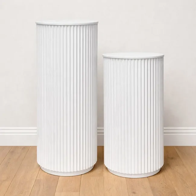 The Nomad Large Plinth is a refined architectural statement designed to elevate interiors with sculptural presence and clean, contemporary lines. Its tall cylindrical form is detailed with subtle vertical fluting, creating texture and visual interest while maintaining a minimalist aesthetic. Finished in crisp white, this plinth provides a versatile foundation for displaying art, plants, vases, or decorative objects. With its generous height, it brings balance and impact to living spaces, entryways, retail environments, or styled interiors.