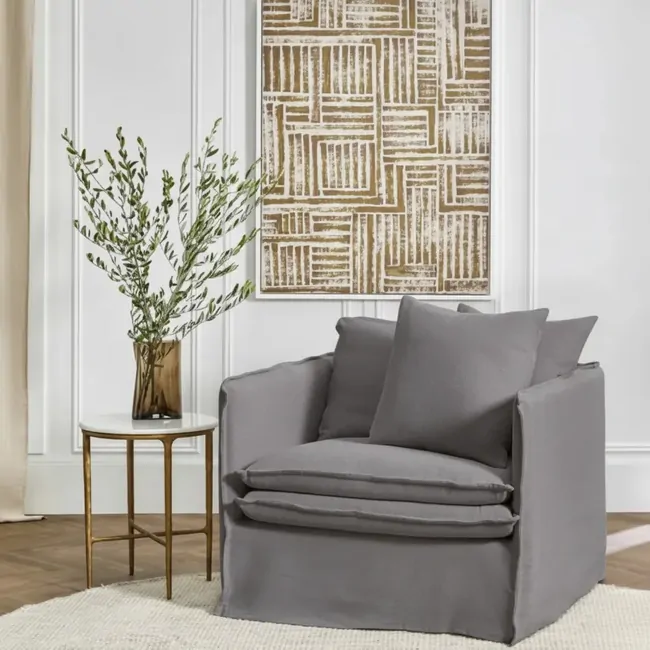 Experience the epitome of Hamptons-inspired luxury with our Palm Beach Armchair. Indulge in pure comfort with soft feather and foam-filled seating, ensconced within a robust hardwood frame. Seamlessly blending elegance with practicality, draped in slate grey linen, a harmonious blend of 50% cotton and 50% linen. Featuring removable covers for effortless maintenance and reversible cushions for enhanced adaptability, elevate your interior design with the exquisite sophistication of the Palm Beach collection, available in white, slate grey, or natural linen, with coordinating sofas to complete the look. Professional dry cleaning services only.